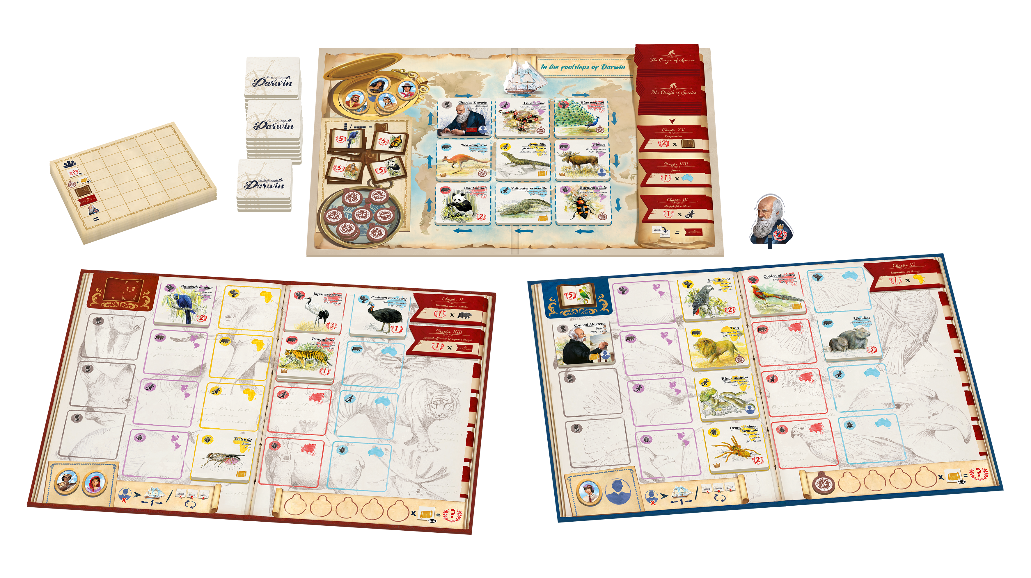 ● 1 tablero de Viaje● 64 losetas de Animal● 16 fichas de Publicación● 1 ficha de Darwin● 15 fichas de Brújula● 1 ficha del Beagle● 5 cuadernos de Naturalista● 5 losetas de Personaje● 28 losetas de Teorías● 10 fichas de Guía● 1 libreta de puntuación● 1 bolsa de género● 1 reglamento● 1 apéndice